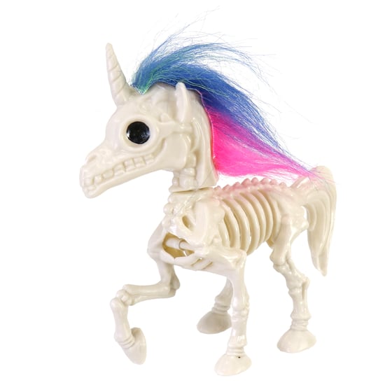 Crafted from lightweight plastic with a colourful faux hair mane, this little skeleton stands proudly on four legs with a raised front hoof—ready for action. It’s compact enough to place anywhere but eye-catching enough to get attention. Whether you're creating a magical graveyard scene, a themed playroom shelf, or just want something different from pumpkins and spiders, this unicorn delivers charm and chuckles in equal measure.