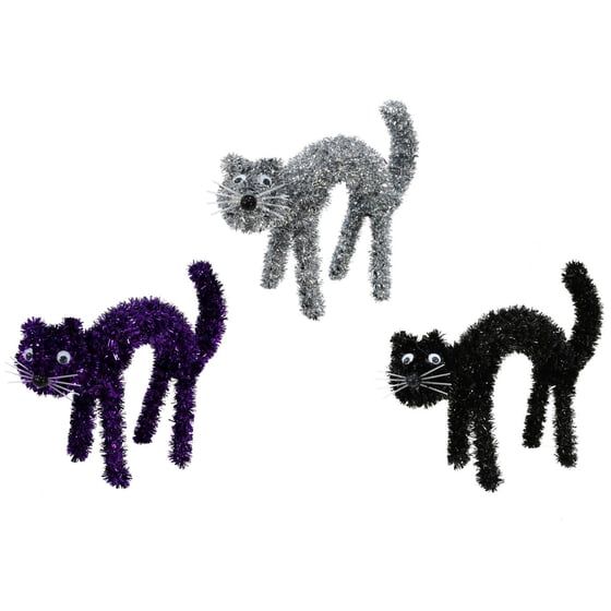 Add some festive feline flair to your Halloween decorations with this Halloween tinsel arched Cat! This 20cm cat figure is made of tinsel and features an arched back, adding a spooky yet playful touch to any display.