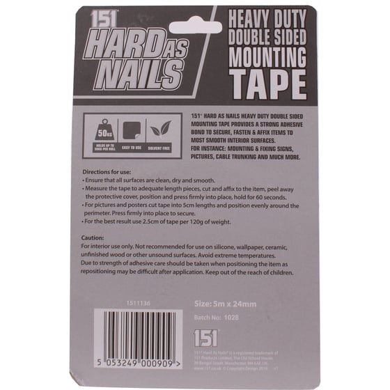 151 Hard As Nails Heavy Duty Double Sided Mounting Tape Provides A Strong Adhesive Bond To Secure, Fasten And Affix Items To Most Smooth Interior Surfaces.