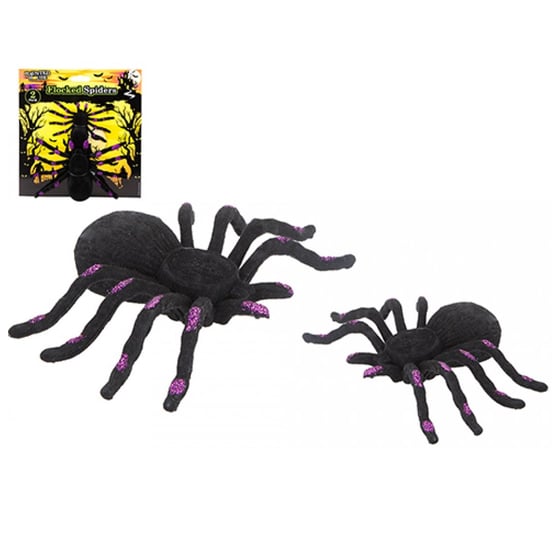 Add a creepy touch to your Halloween decor with this set of two flocked spiders.