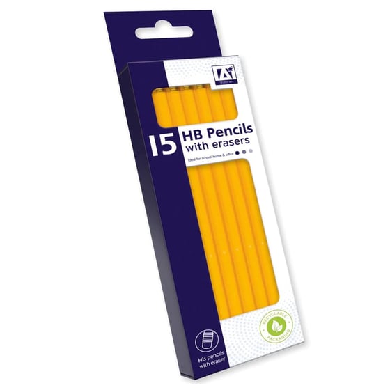 HB pencils in yellow with eraser tops. HB pencils are a staple in any artists arsenal, they are ideal for writing, outlining, sketching and tracing. Each one comes with an eraser on the top so you can remove any mistakes you make without having to have extra items with you.