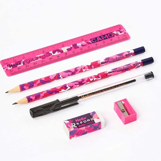 The Oxford camo pink student stationery set from Helix is the perfect addition to any pencil case.