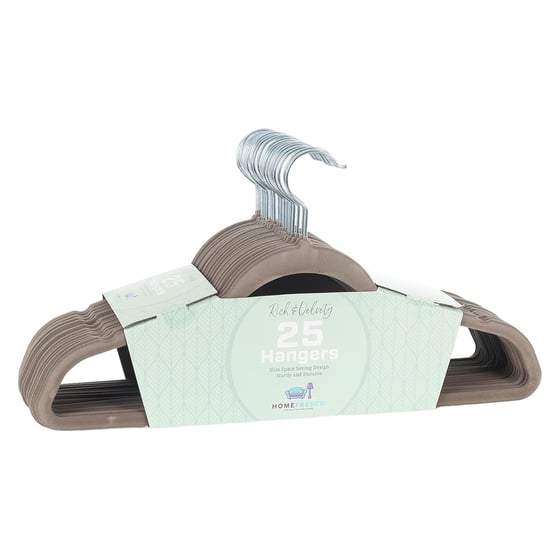 Transform your wardrobe organisation with these sleek grey velvet clothes hangers. The slim profile design maximises your closet space whilst maintaining excellent support for your garments. Each hanger features a non-slip velvet coating that prevents clothes from sliding off, making them perfect for everything from delicate blouses to heavy coats. This practical pack of 25 hangers provides a coordinated solution for a tidy wardrobe. The streamlined construction helps eliminate unsightly shoulder bumps in your clothing, whilst the consistent grey colour creates a sophisticated, uniform look in your closet. These versatile hangers work brilliantly with a wide range of garment types, from shirts and trousers to dresses and suits. The space-saving design allows you to fit more clothing in the same amount of closet space compared to traditional hangers.