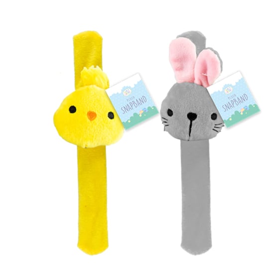 Keep your little ones entertained this Easter with this Hoppy Easter plush snap band This cute snap band features a plush animal design that is sure to bring a smile to your child's face. Simply snap it onto your wrist for a fun and interactive accessory. Perfect for Easter baskets and egg hunts. When snapped against the wrist the band curves to fit the wrist.  Each bracelet is suitable for children and adults.