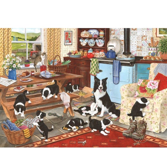 Collie Wobbles is the title of this fantastic 1000 piece jigsaw from House Of Puzzles which is packed with character as it features an array of boarder collies with their mother and cat friend.