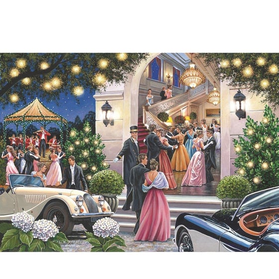 The wonderful High Society 1000 piece jigsaw from House Of Puzzles showcases a traditional society ball with women in bold, elegant gowns and men in their finest suits.
