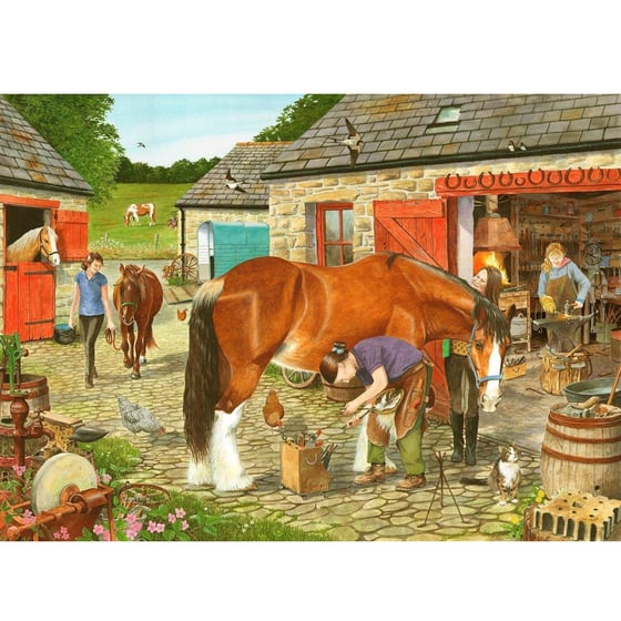 The Shoe Shop 1000 piece puzzle from House Of Puzzles showcases a farrier working on changing the shoes on the large brown horse.