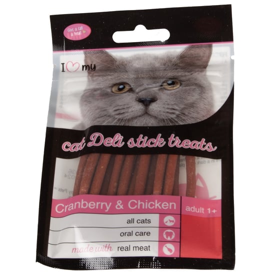 Reward your feline friend with I Love My Pets cranberry & chicken cat deli stick treats! Made with real chicken and infused with the tangy goodness of cranberries, these treats are sure to satisfy your cat's cravings.