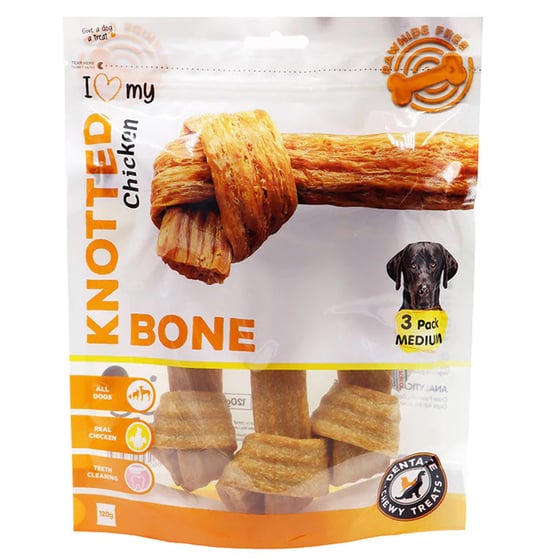 Treat your furry friends to I Love My Pets 3 knotted chicken bones.