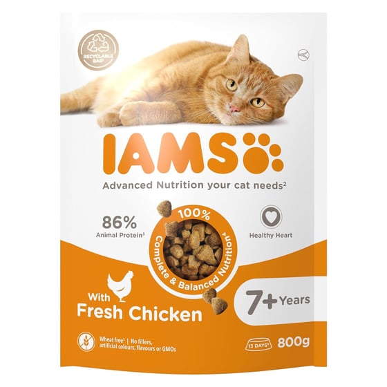 Keep your senior cat happy and healthy with IAMS Complete Dry Chicken Cat Food.