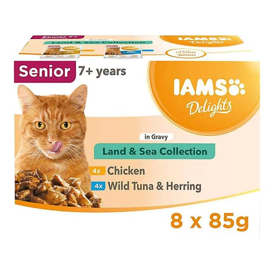 Iams senior cat pouch delights land sea collection gravy 8 pack for tasty senior meals and variety ✓ Senior recipe ✓ In gravy ✓ 8 pack.