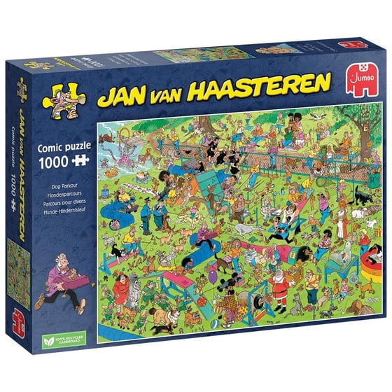Get ready to be entertained for hours with the Jan Van Haasteren dog parkour jigsaw puzzle! This 1000 piece puzzle features the light-hearted and humorous artwork of Jan Van Haasteren, and will provide you with endless fun and challenge.