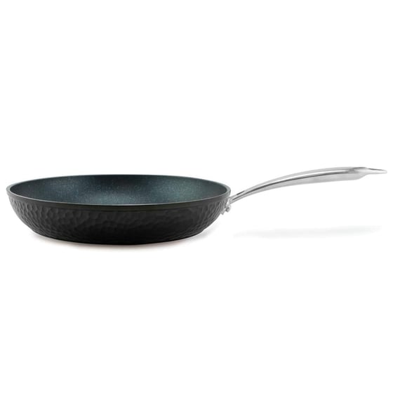 The frying pan has been built with a forged aluminium body with a stainless steel base which will provide terrific durability and fantastic heat distribution. The beautiful hammered finish adds elegance to any kitchen and provides outstanding durability and scratch resistance.