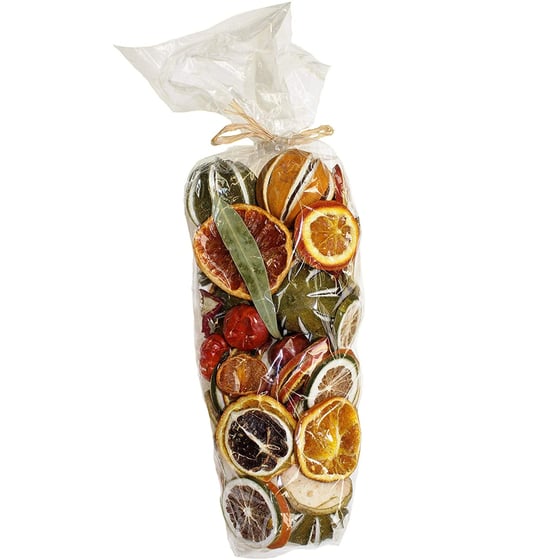 The Jormapouri Christmas pot pourri bag contains a selection of dried fruits including oranges, apples, limes and orange slices which are green and orange.