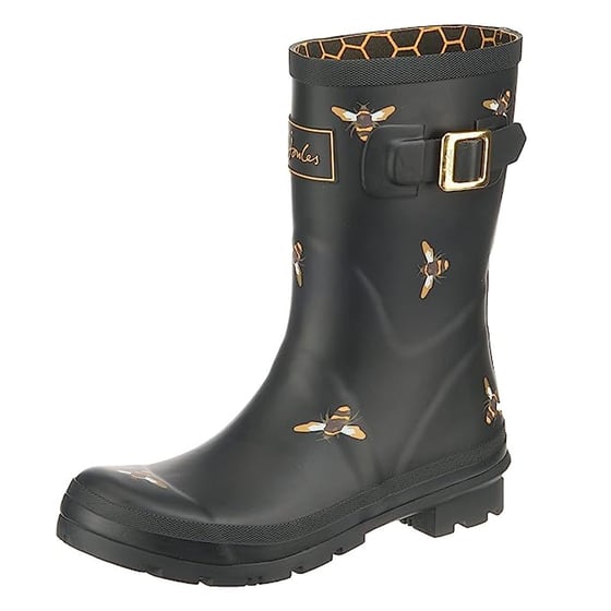 Joules Women's Molly mid-height wellies allow ease of movement and are comfortable for all calf sizes and heights. They are much loved due to their hardwearing rubber, and an adjustable side strap for ultimate fit but most of all, the beautiful hand-drawn prints that adorn them. The boots are ideal for all seasons and occasions, whether it be pottering around the garden, a muddy country walks or an upcoming festival. The design features an adorable bumblebee pattern with a trendy shade of black with a chic gold stripe.