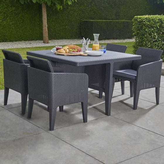 If you have a limited amount of space outdoors, don't worry, you can think big when it comes to entertaining and welcoming guests to your home thanks to this Santiago graphite 4-seater set from Keter that has an innovative space-saving design as the backrest can be fully bent downwards when not in use. The set will meet all your al fresco dining needs and more.
