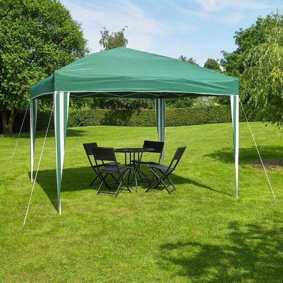 The Kingfisher Gazebo Party Tent is crafted with a durable, powder coated steel frame, designed with a green and white covering.