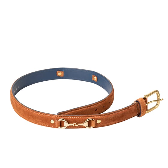 Tan Suede Leather Belts with navy interior and horse snaffle embellishments, the perfect addition to any country ladies wardrobe.