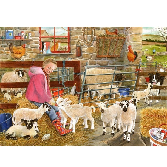 This 500-piece puzzle of large pieces features a charming illustration of a child feeding her lambs.