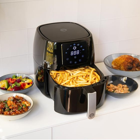 Take advantage of 7 distinct cooking pre-sets and tailor the temperature up to 200°C using it's digital display. This MasterChef air fryer can fry, bake, grill, roast, and even reheat. With 360-degree hot air circulation, a non-stick grill, and a crisper plate, you can relish healthily, flawlessly cooked food that’s crispy on the outside and tender on the inside.