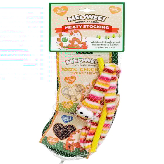 The meaty cat stocking is the ideal gift for your feline friend as it provides them with whisker-lickingly good meats and a fun toy for your cat.