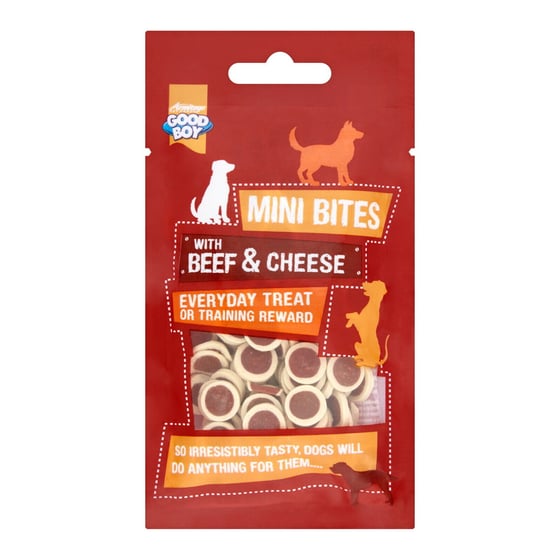 Give your dog something new to chew on with the tasty mini bites of beef and cheese from the good boy. These wonderful chews are the perfect treat for your canine companion! These chewy bones are made with natural meat, so they're sure to become your dog's favourite treats. Packed in a resealable bag, the treats will stay fresher for longer, perfect for rewarding good behaviour.