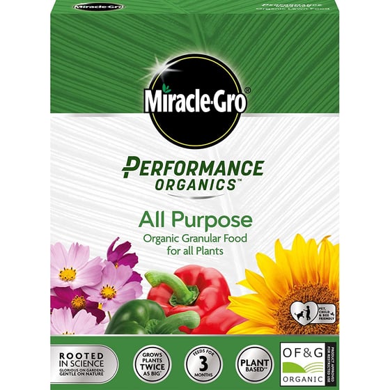 The Miracle-Gro performance organics all purpose granular plant food is a high performance and 100% organic feed which is perfect for use in hanging baskets, pots and containers weather they are inside or outside. The high performance organic granular plant food helps plants grow twice as big organically.