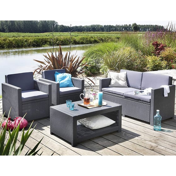 The Monaco graphite 4-seater set from Keter is perfect for indoor & outdoor use making the set ideal for the garden, patio, conservatories, and entertaining spaces. The furniture set features a lovely resin rattan-wicker design that brings a distinctive flair by combining dining, seating, and decorative elements to any space. The lounge set has been built for comfort and includes a 2-seater sofa, garden table, and chairs and can accommodate up to 4 people.