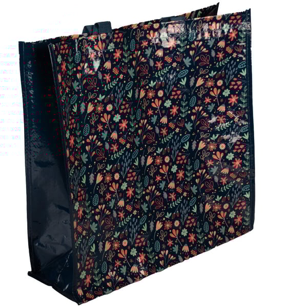 This reusable shopping bag in navy blue with a floral design is perfect for your next trip to the shops.