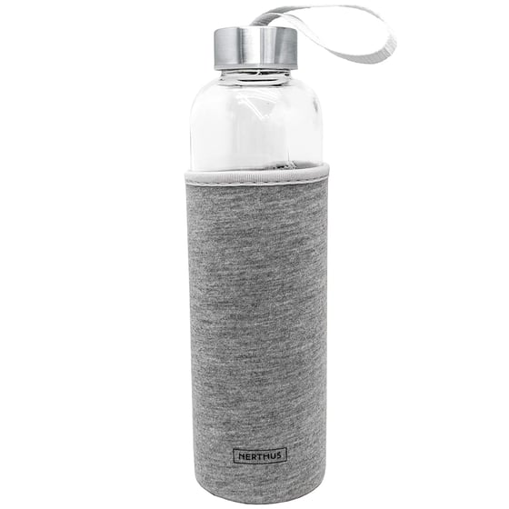 Stay hydrated and stylish with the Nerthus grey neoprene glass bottle.