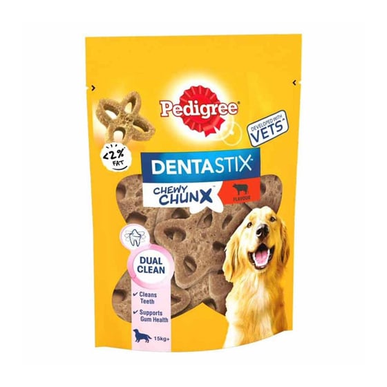 Indulge your dog in the irresistible taste of Pedigree Dentastix Beef Chewy Chunx! The unique shapes and texture are designed to reduce plaque and tartar buildup as your pup chews its way to a healthier and happier smile. Your furry best friend will love the delicious taste of beef in every bite, while you'll love knowing they're getting the dental care they need. Give your pup a treat that's not only enjoyable, but beneficial!
