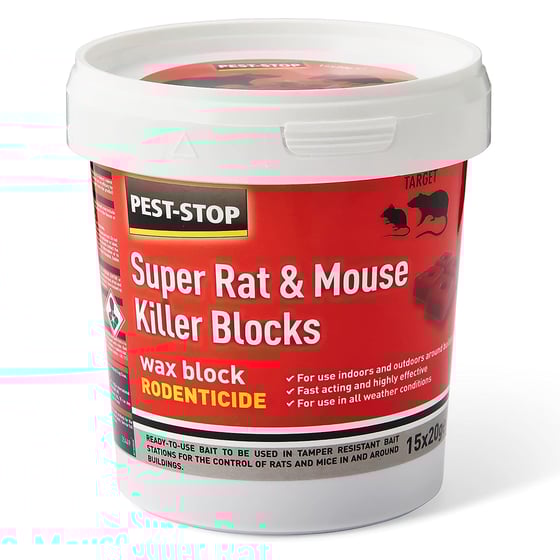 The Super Rat & Mouse Killer blocks from Pest-Stop a ready-to-use bait that can be used in tamper-resistant bait stations for the control of rats and mice and around buildings.