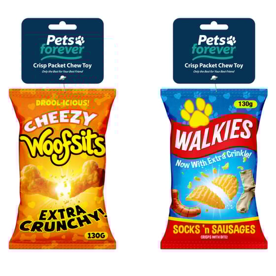 With its bright and playful crisp packet designs, including humorous flavours like Cheezy Woofsits and Walkies Socks 'n Sausages, this toy adds a touch of fun to your dog’s toy collection. Ideal for solo play or games with their owner, the crinkle sound stimulates natural curiosity and keeps boredom at bay.
