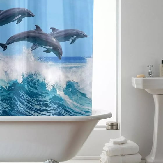 Transform your bathroom into a tranquil oasis with the Country Club dolphins shower curtain.