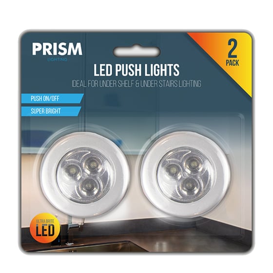 The 2 pack of LED push lights from Prism is ideal for use within cupboards, garages, and under-shelf lighting.