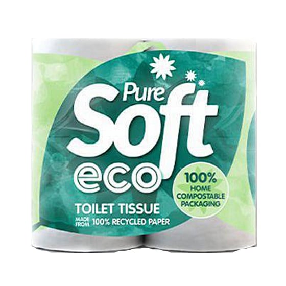 Pure Soft Eco 100% Recycled, Quick Dissolve Toilet Rolls 4 Pack This 2-ply Soft Quilted Toilet Paper Is Made From 100% Recycled Paper.