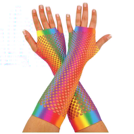 Add a touch of playfulness to any outfit with this Rainbow long fingerless fishnet gloves.