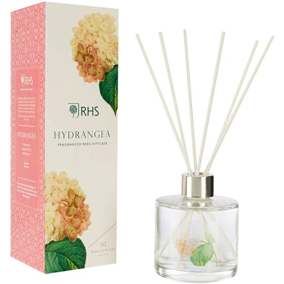 Make your house a home with the beautiful fragrant ambience of this Hydrangea reed diffuser from the RHS collection by Wax Lyrical. The soft scent of rose and fresh hydrangeas in the essential oil is dispersed evenly through the diffuser reeds to lift the room and complement its surroundings. You will really feel like you are relaxing in a beautiful garden, sliding into pure bliss with a fresh drink.