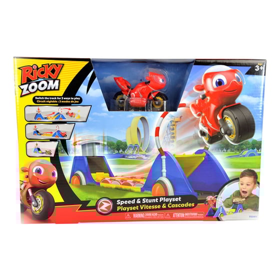 The Ricky Zoom Speed & Stunt Playset gives kids many ways to play! Give Ricky an extra burst of speed with the super launcher, transform the track and try for a longer super dash, or transform again and do a super jump through the hoop!