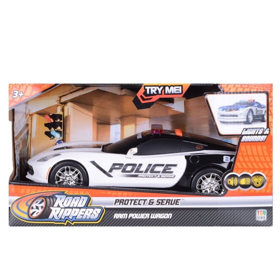Experience the thrill of the chase with the Road Rippers Protect And Serve Police Car. With realistic lights and sounds, this car will make playtime more exciting. Let your child's imagination run wild as they race to save the day and protect the city. The perfect gift for any aspiring police officer. The streets will be safer with the Chevy Corvette C7 police car! The panel on the body of the car controls the motorized movement, activates the light bulbs, realistic sounds and music.