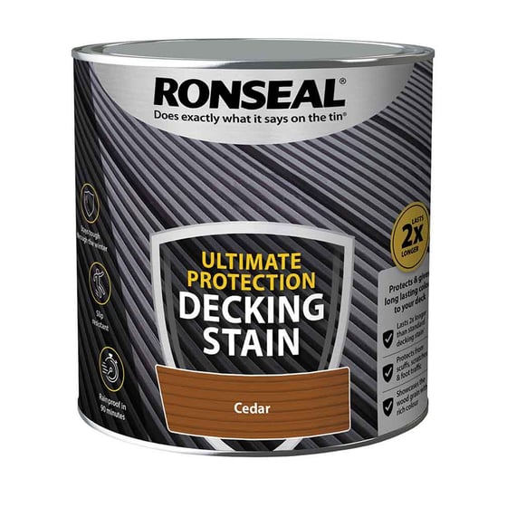 Whether you’re getting your garden summer-ready or weatherproofing ahead of winter, Ronseal Ultimate Protection Decking Stain in Cedar is the smart choice for lasting results. Specially formulated to give your decking a warm, natural finish, this advanced stain doesn’t just look good—it works hard too. Offering twice the durability of standard stains, it defends against foot traffic, scuffs, UV rays and rain, so your decking stays looking better for longer.