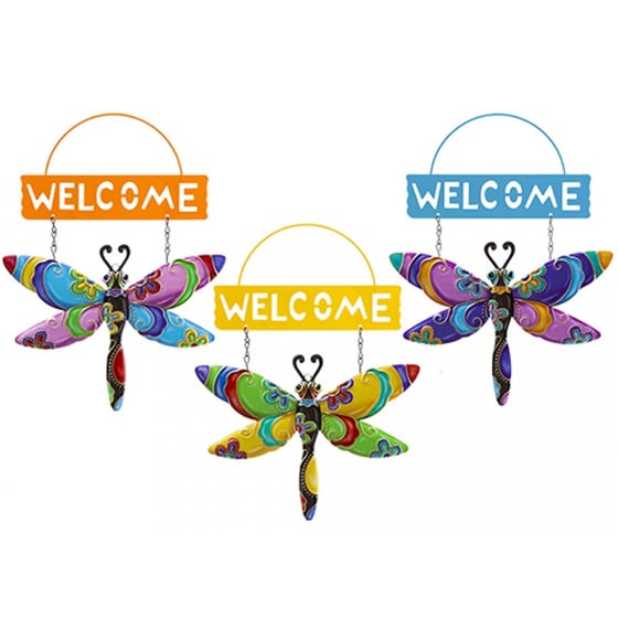 Add some colour and interest to your outdoor areas with this fantastic dragonfly garden welcome sign which has been made with metal material and features a 'Welcome' plaque at the top.