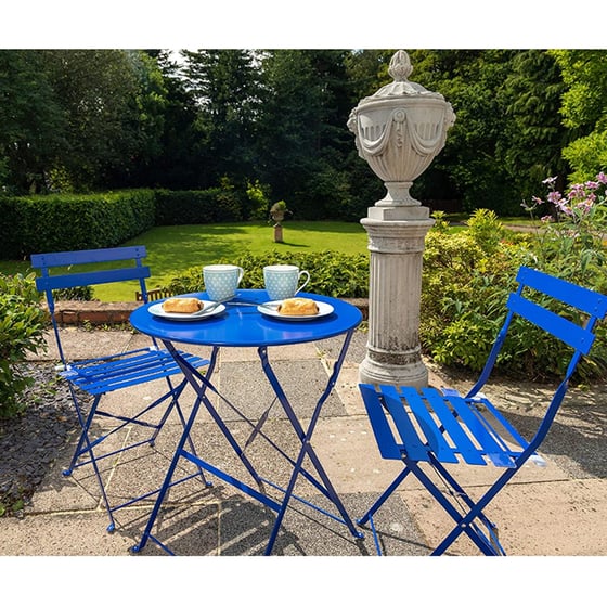 Relax in style this summer whether you're having a morning coffee or enjoying drinks with friends or just enjoying the warm weather watching the world go by, this navy blue metal 2 seater & table bistro set is for you.