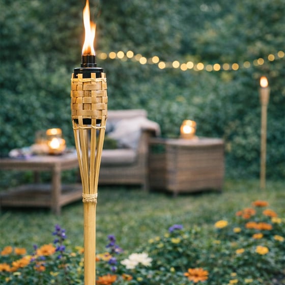 Built with a traditional bamboo style body and a sturdy ground spike, the torch can be easily placed into soil around flower beds, lawns, and garden paths. Its 120cm height helps the flame sit clearly above plants and borders, creating a warm focal point while gently lighting the surrounding area. The woven bamboo detail adds rustic character that suits both modern and traditional gardens, making it a versatile decorative lighting option. Perfect for anyone searching for a bamboo garden torch, outdoor tiki torch, or decorative garden flame torch, this piece offers an easy way to enhance evening gatherings and outdoor relaxation.
