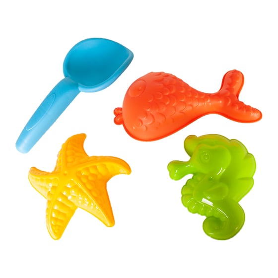 This fun beach toy pack includes 3 animal shapes—starfish, fish, and seahorse—in bright colours, plus a small spade.