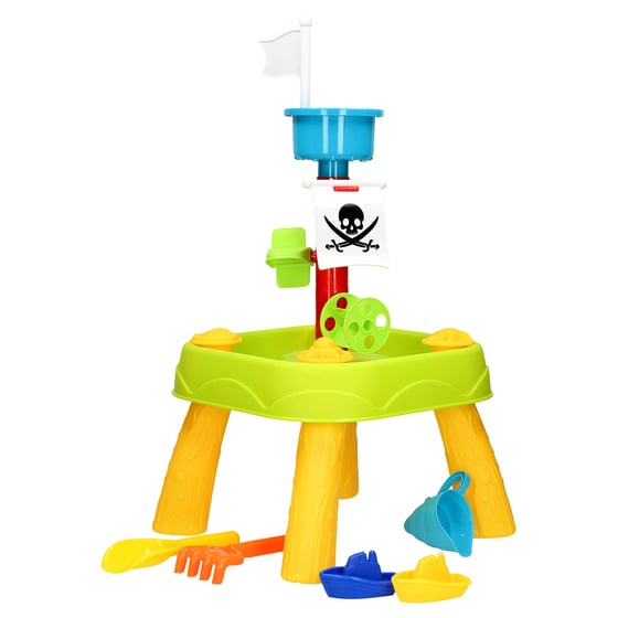 Sand and water table with toys and water wheels, perfect for summer garden fun.
