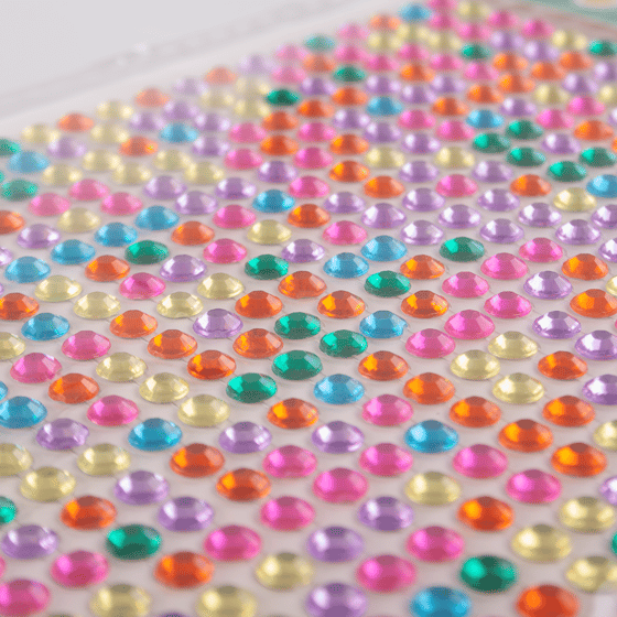 Self-adhesive gemstone stickers in pink, purple, green, yellow, orange, and blue.