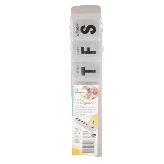 Stay organised with this practical Seniors Aid 7 Day Jumbo Pill Organiser, designed to make medication management simple and stress-free. The weekly medicine storage box features spacious compartments for each day, perfect for those who take multiple medications or supplements. The jumbo-sized design ensures easy access and visibility, whilst the clear labelling helps maintain your daily medication schedule. Each day's compartment is thoughtfully divided, allowing you to sort your medicines for different times of the day. The sturdy construction provides reliable storage, and the practical design makes it an ideal solution for both home use and travel. This pill organiser helps eliminate confusion and ensures you never miss your daily medications. Whether you're managing your own medication routine or helping a loved one stay on track, this pill organiser offers a practical solution for keeping medicines properly arranged throughout the week.