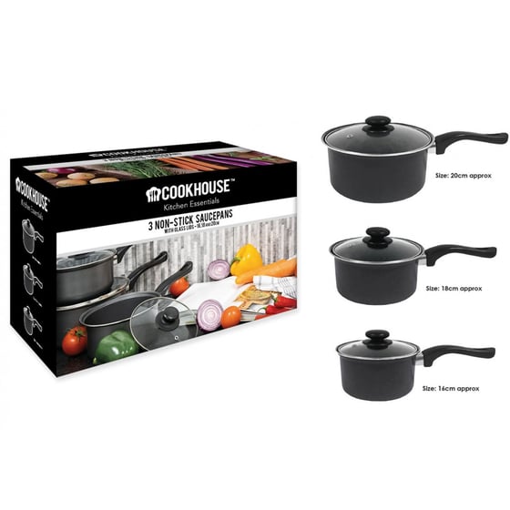 Cook some delicious meals with this set of 3 non-stick saucepans from Cookhouse which is a kitchen essential for any cook in the home. Each saucepan has been made from carbon steel with a goldflon nonstick coating which will ensure easy cleaning up. The set includes a 16cm, 18cm & 20cm saucepan with each one accommodating to the types of food depending on size.