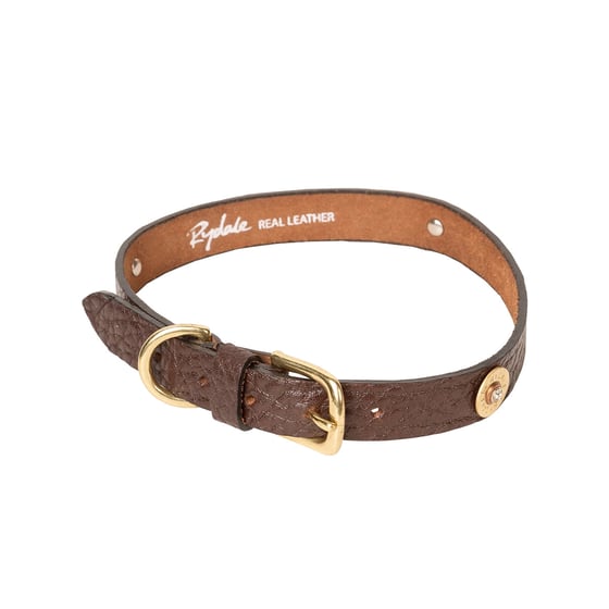 Brown leather dog collar with shotgun shell detail, available in sizes Small Medium and Large.